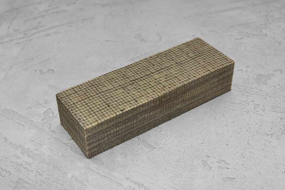 Блок для всадного монтажа рукояти ножа изготовлен методом вакуумного прессования из натурального джутового волокна и окрашенной эпоксидной смолы. Благодаря этому материал обладает оригинальной текстурой, насыщенным цветом и приятно ощущается в руке. Хорошо обрабатывается и полируется.