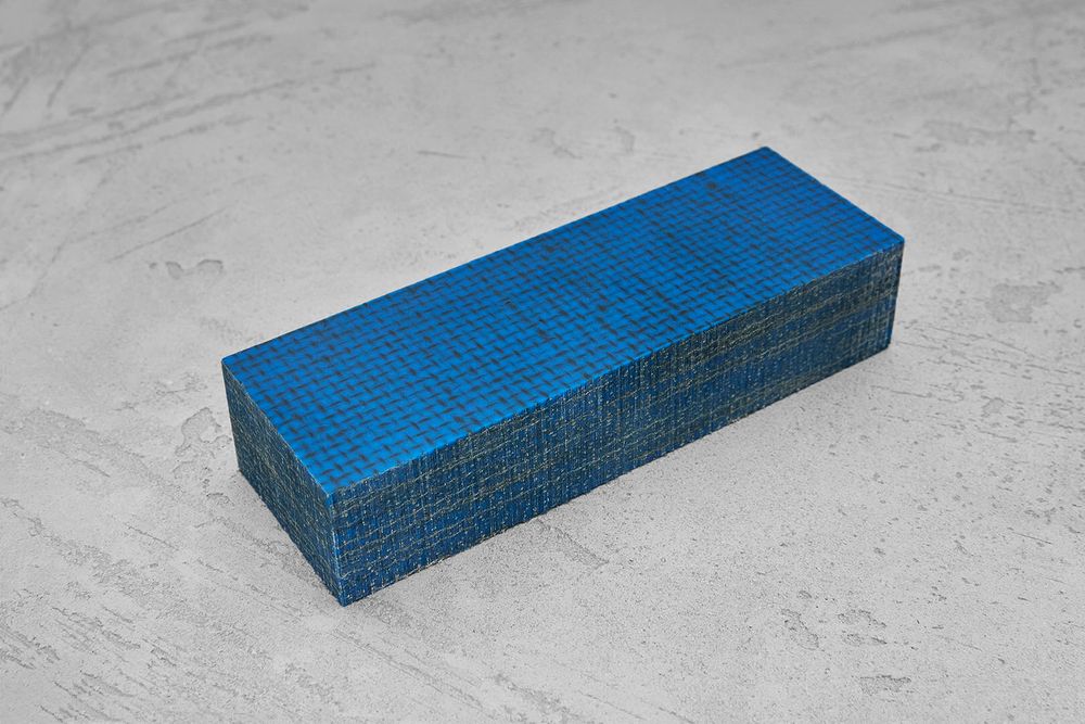 Блок для всадного монтажа рукояти ножа изготовлен методом вакуумного прессования из натурального джутового волокна и окрашенной эпоксидной смолы. Благодаря этому материал обладает оригинальной текстурой, насыщенным цветом и приятно ощущается в руке. Хорошо обрабатывается и полируется.